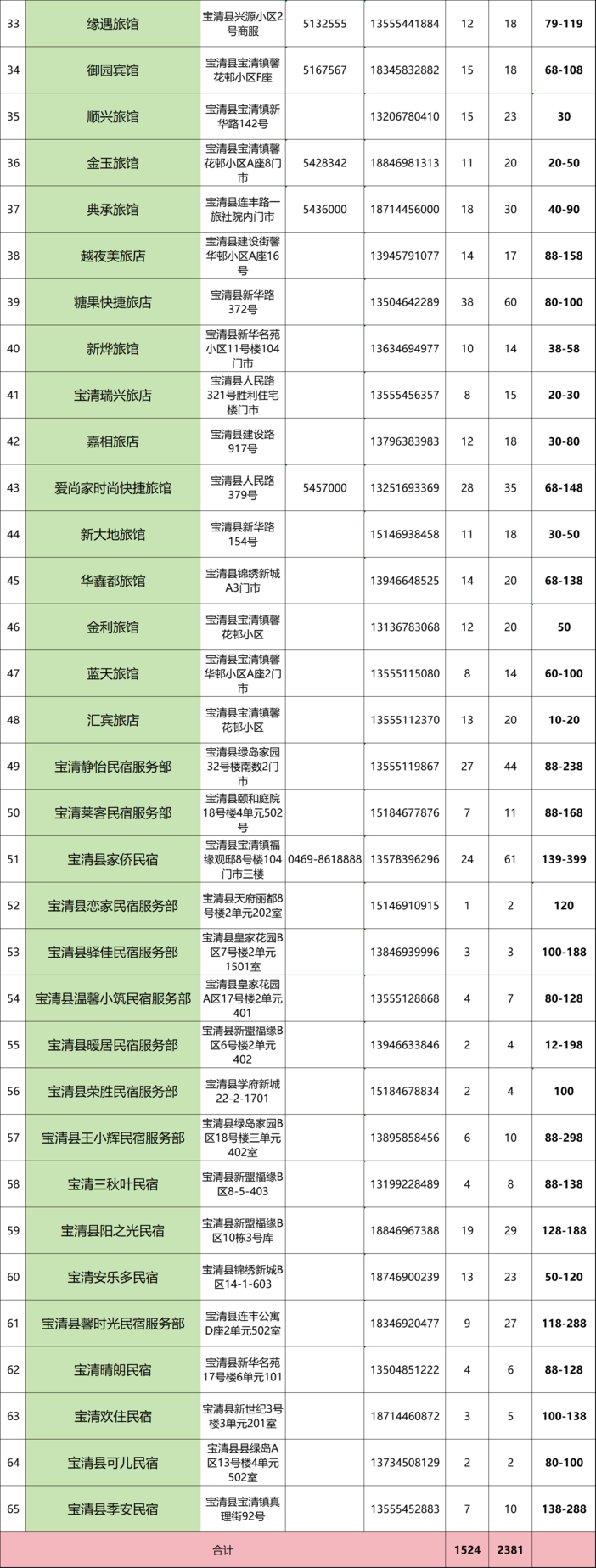 其中宾馆旅店48家(含洗浴4家),民宿17家。